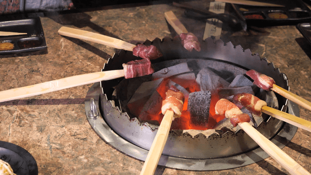 숯불 화로 위에서 구워지는 다양한 꼬치들