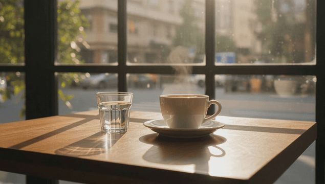 대낮에 창가에서 따듯한 카페 라떼를 즐기는 여성