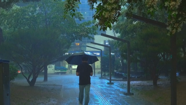 비 오는 날 우산을 쓰고 걸어가는 사람들