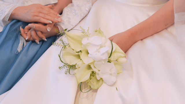 부케를 든 손을 잡고 있는 다정한 신부와 어머니