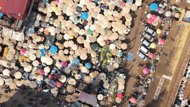 야외 시장의 금속 찜기에서 음식을 찌는 장면