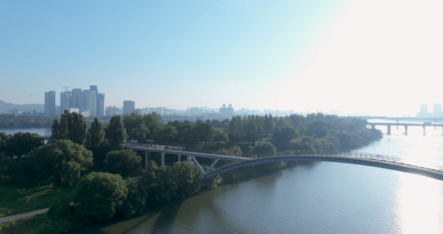 햇빛이 비치는 한강 위 다리와 도시 스카이라인