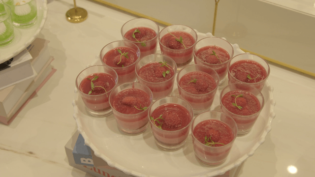 쟁반 위에 놓인 우아한 디저트 잔들
