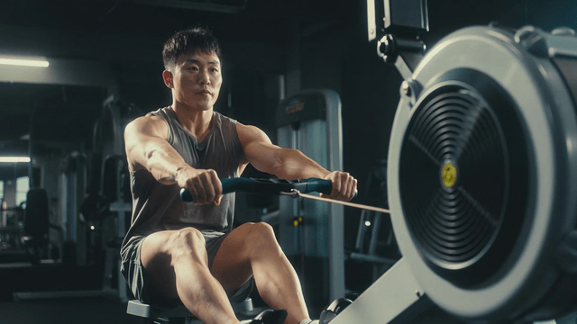 체육관에서 로잉 머신으로 운동하는 남성
