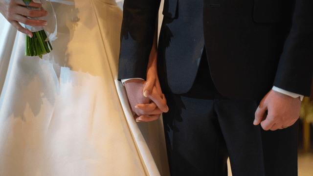 야외 정원에서 손을 잡고 있는 신랑 신부