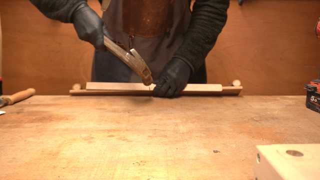 작업장에서 목재에 긴 볼트를 조이는 목공