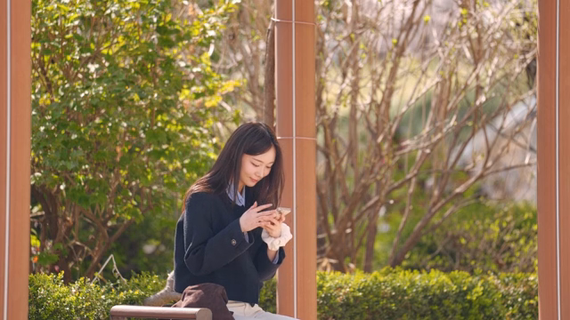 공원 벤치에 앉아 셀카를 찍으며 누군가를 기다리는 여성