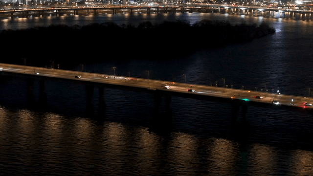 저녁 시간 조명이 켜진 한강 다리를 지나가는 차량