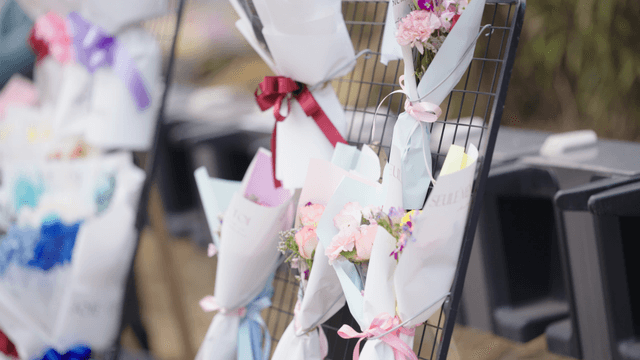쓰레기장 앞 쓰레기 봉투에 버려진 꽃다발