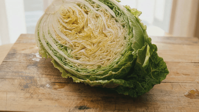 도마 위에서 칼로 신선한 배추를 자르는 사람