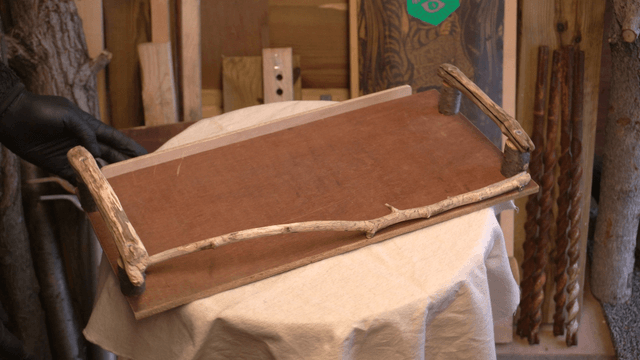 금속 손잡이가 박힌 나무판을 뒤집어 보는 장인
