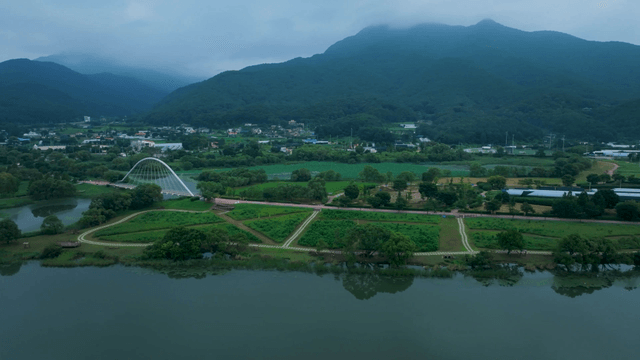 다리와 산이 있는 경치 좋은 강
