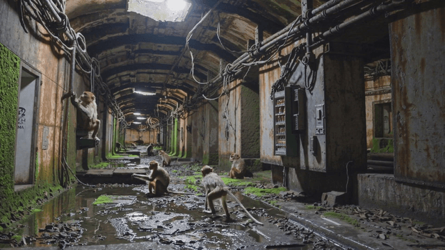 그래피티가 그려진 벽을 지나가는 원숭이들