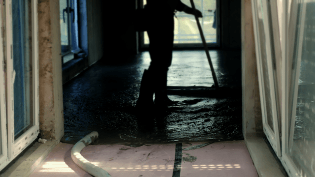 실내에서 콘크리트 바닥을 고르는 작업자