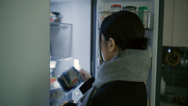 얼굴에 상처가 난 여성이 냉장고 속 음식을 허겁지겁 먹는 모습