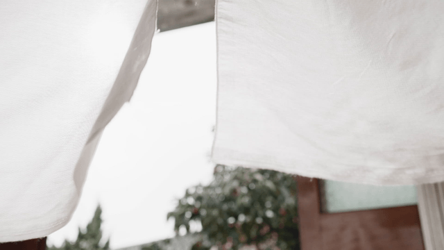 밝은 방에서 함께 빨래를 널고 있는 젊은 커플