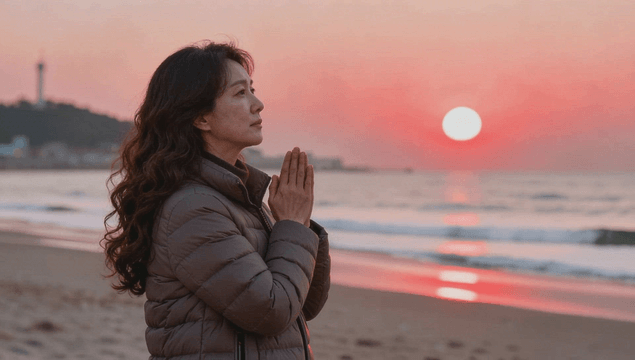 해변에서 일출에 소원을 비는 여성
