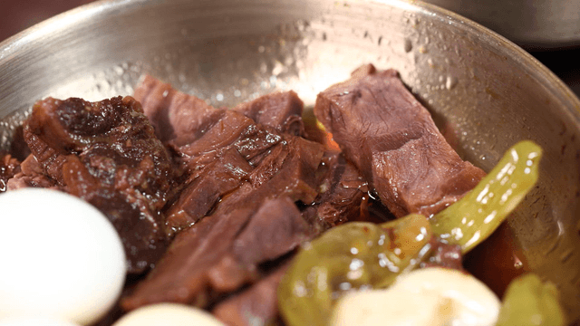 달걀과 소고기가 고명으로 올라간 국수에 부어지는 따뜻한 육수