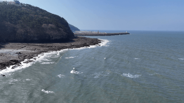 바다 옆 무성한 나무들이 있는 바위 절벽