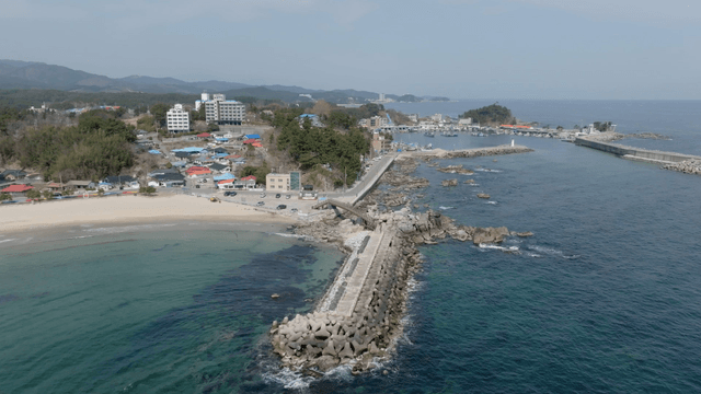 경치 좋은 해변과 언덕이 있는 해안 마을