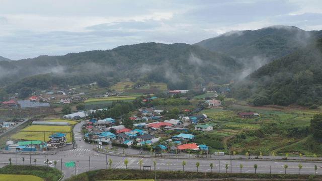 푸른 산으로 둘러싸인 시골 마을