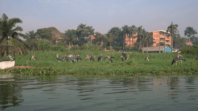 도시 근처 맑은 하늘 아래 강둑에서 새들이 있는 장면