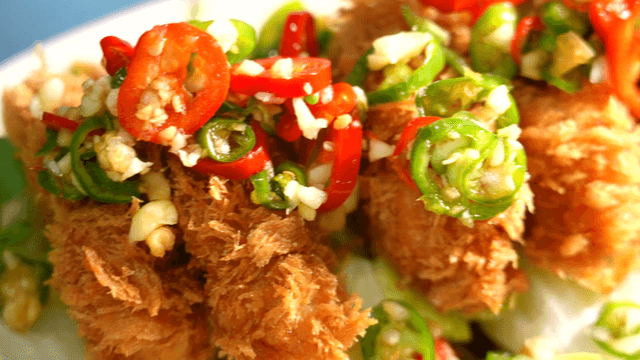다채로운 고추 고명이 얹어진 바삭한 유린복 튀김