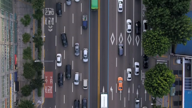 번잡한 도심 도로 교차로의 상공에서 본 전경