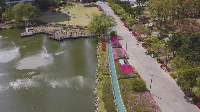 고요한 호수와 경치 좋은 공원의 항공 뷰