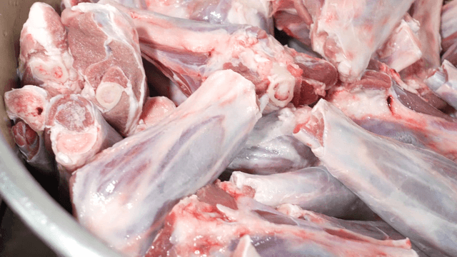 김이 나는 냄비에서 삶아진 양고기 다리
