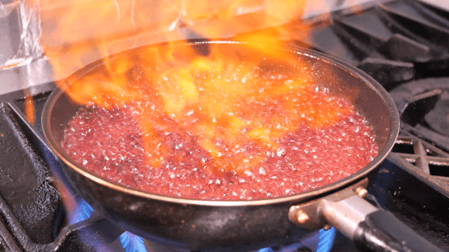 프라이팬에서 불꽃이 올라오는 장면