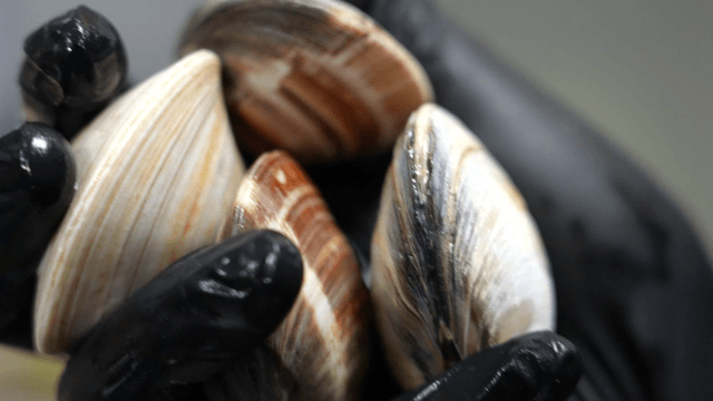 장갑 낀 손으로 조개와 살을 분리하는 모습