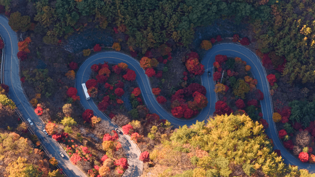 알록달록한 가을 숲을 지나는 구불구불한 도로