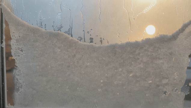 창문에 쌓인 눈과 물방울