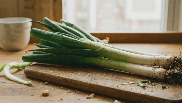 작은 도마 위에서 당근과 파를 칼로 손질하는 모습