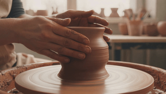 도자기 물레에서 점토를 빚는 섬세한 강의