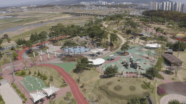 놀이터와 산책로가 있는 공원의 항공 뷰