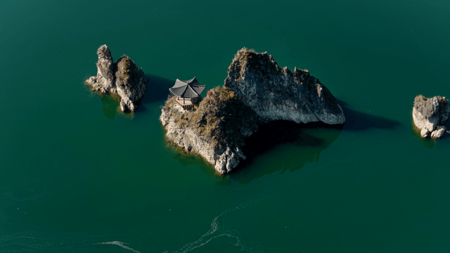 바위로 둘러싸인 섬 위에 자리한 전통 정자