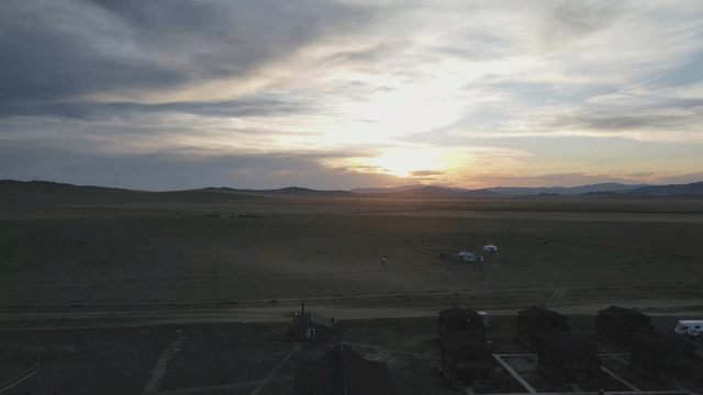 멀리 유르트가 보이는 광활한 사막 풍경