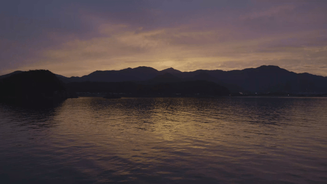 멀리 언덕이 보이는 고요한 바다의 일몰