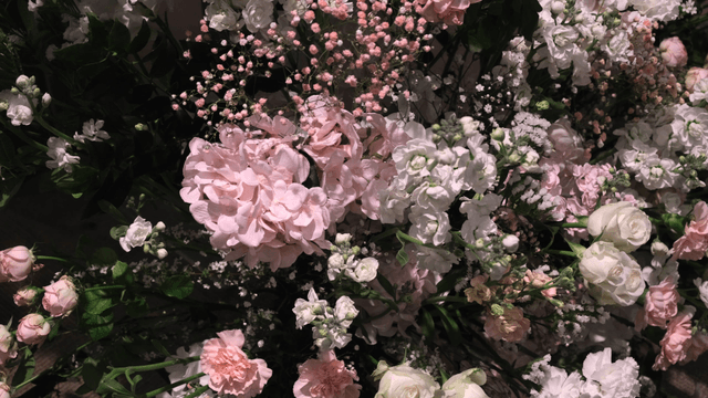 실내에서 두 개의 꽃다발을 들고 있는 사람