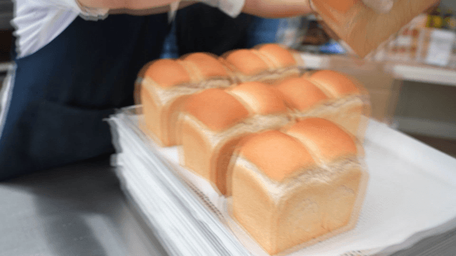 나무 테이블 위에 갓 구운 빵을 상자에 포장하는 모습