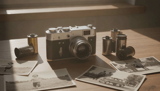 테이블 위의 빈티지 카메라와 오래된 가족 사진