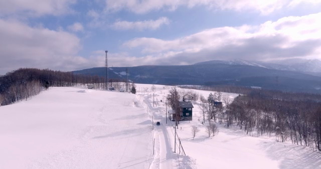 눈 덮인 산과 오두막 앞 도로