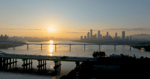 도시 스카이라인과 강 위의 일출