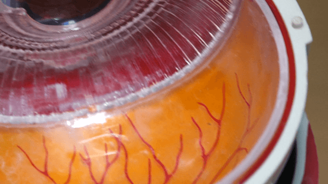 눈 해부도 차트를 들고 각막을 닦는 방법을 설명하는 의사