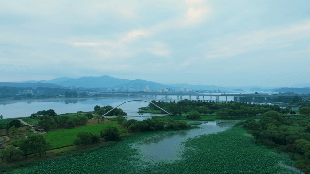 얼어붙은 강 위의 눈 덮인 풍경과 다리들