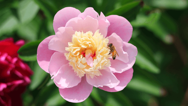 햇빛 아래 분홍색 철쭉꽃에 앉은 꿀벌