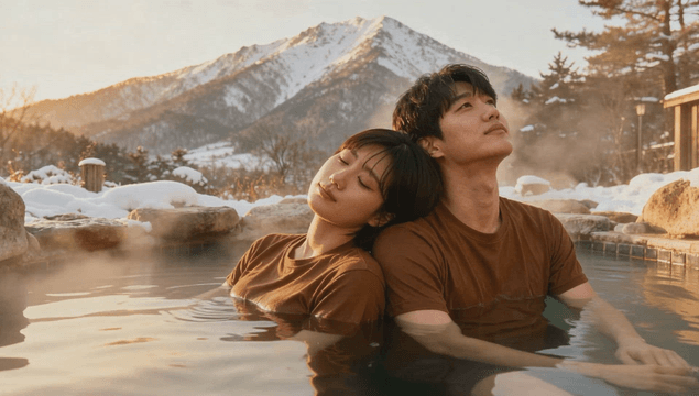 눈 덮인 산을 배경으로 온천에서 휴식을 취하는 커플