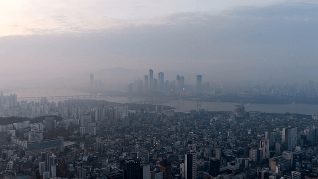 고층 건물과 안개가 있는 해안 도시